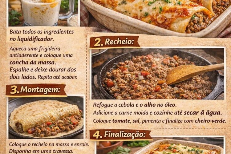 A panqueca de carne moída com molho é uma daquelas receitas clássicas que atravessam gerações. Presente nas mesas de família, nos almoços de domingo e até nas marmitas vendidas com carinho, ela combina simplicidade, economia e muito sabor. A massa leve e macia envolve um recheio bem temperado, suculento e equilibrado, enquanto o molho de tomate completa o prato trazendo um toque especial que deixa tudo ainda mais apetitoso.