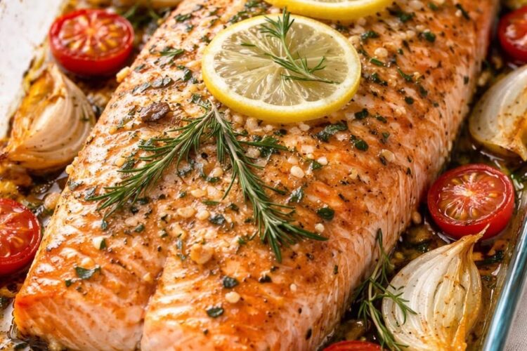 Este salmão assado simples e suculento é a prova de que não é preciso complicar para comer bem. Com poucos ingredientes, preparo prático e um resultado digno de restaurante, essa receita é perfeita tanto para o dia a dia quanto para ocasiões especiais. O peixe fica macio, úmido, cheio de sabor e acompanhado de batatas assadas que absorvem todo o tempero. Uma refeição completa, equilibrada e irresistível.
